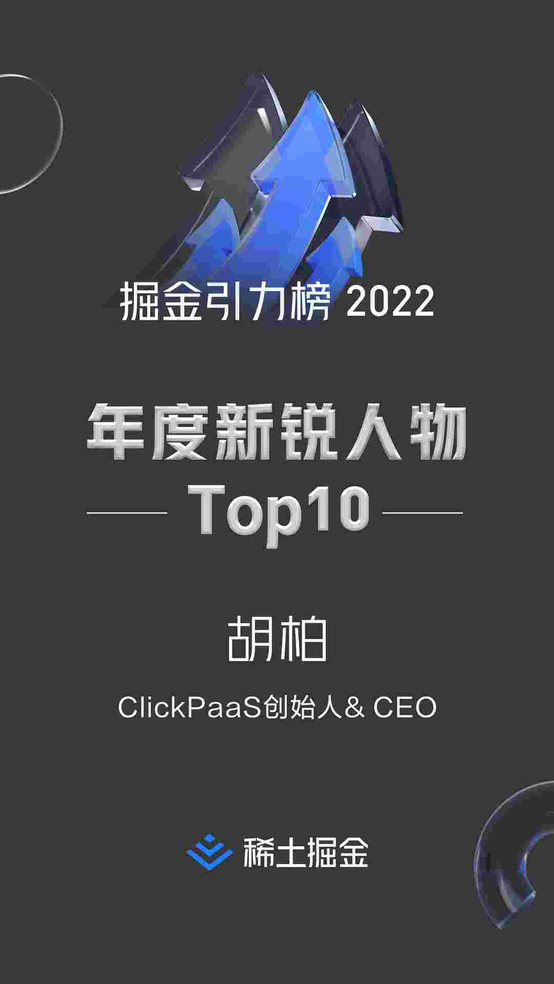 2022年1月6日,,,,,,,,稀土掘金社区第一届「掘金未来大会」成功举办,,,,会上发布了“2022 稀土掘金引力榜 年度新锐人物”榜单,,,,,,,上海爱湃斯科技有限公司(简称小微钱包)创始人及CEO胡柏实力入选年度新锐人物TOP 10。。。。。。